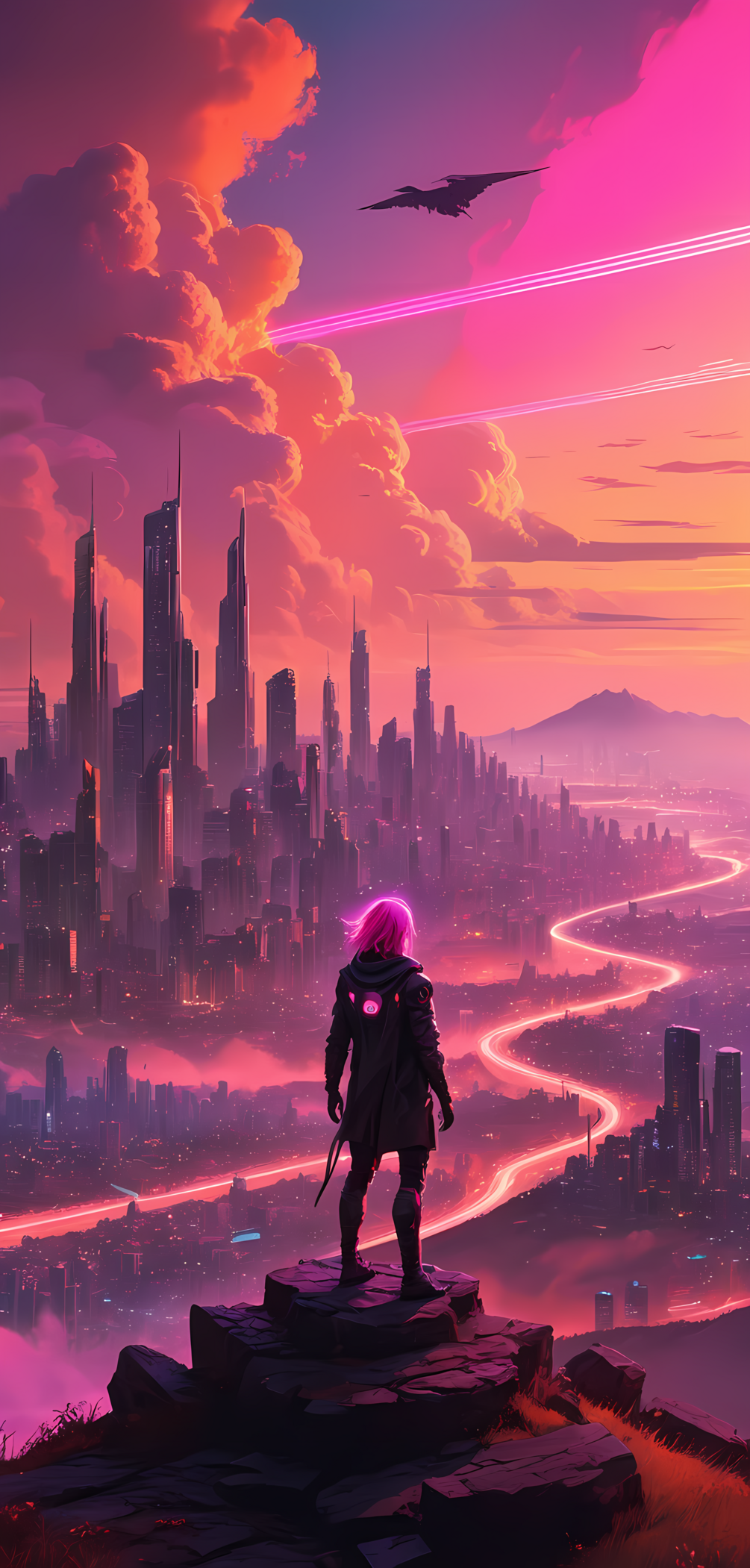 Keywords: Neon, Anime, Digital Art, Sci-Fi, Futuristic, Pink Lighting, High-Resolution.
